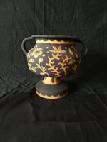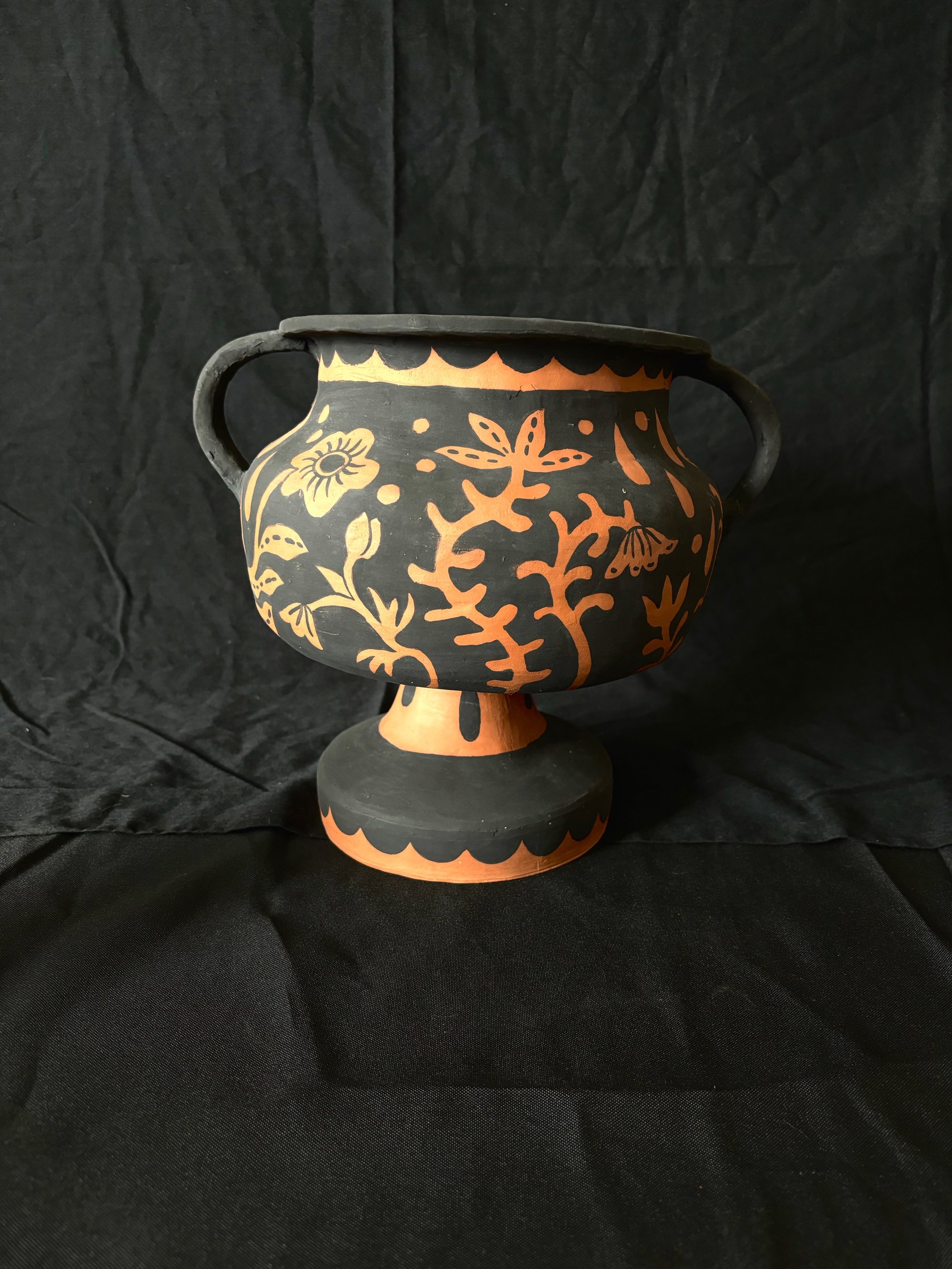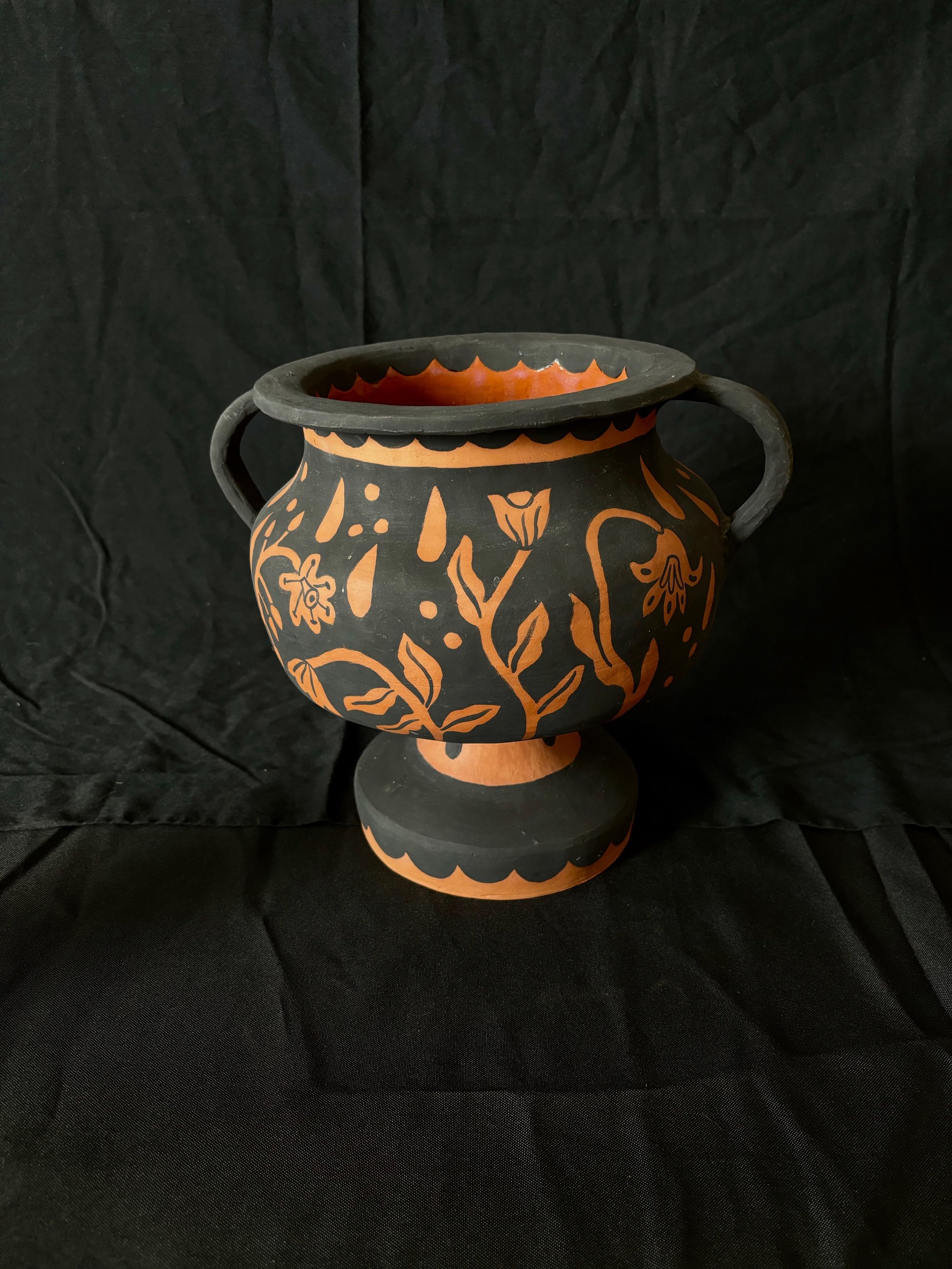 A one off earthenware terracotta urn with velvet underglaze decorations. Unglazed.