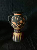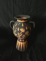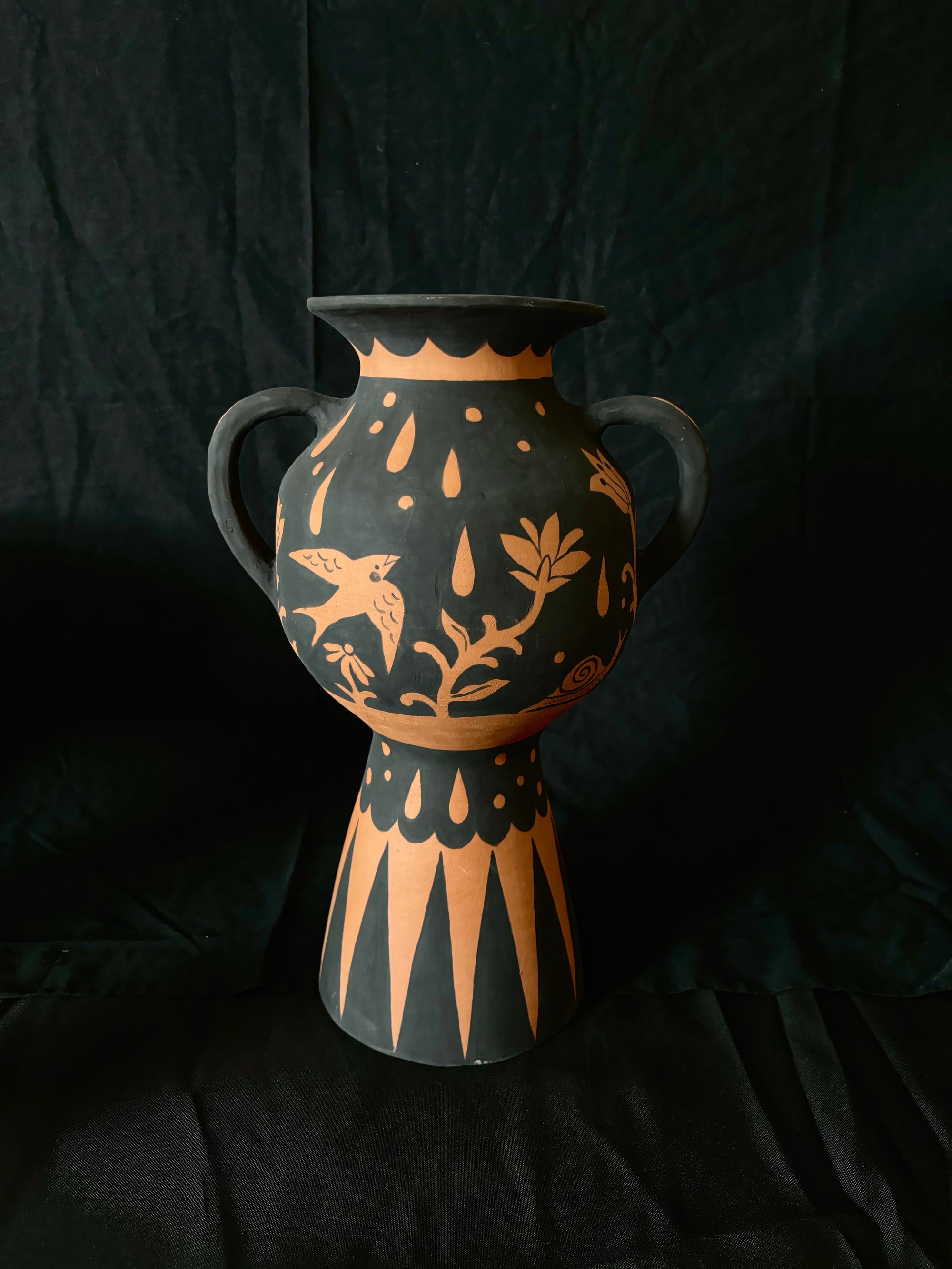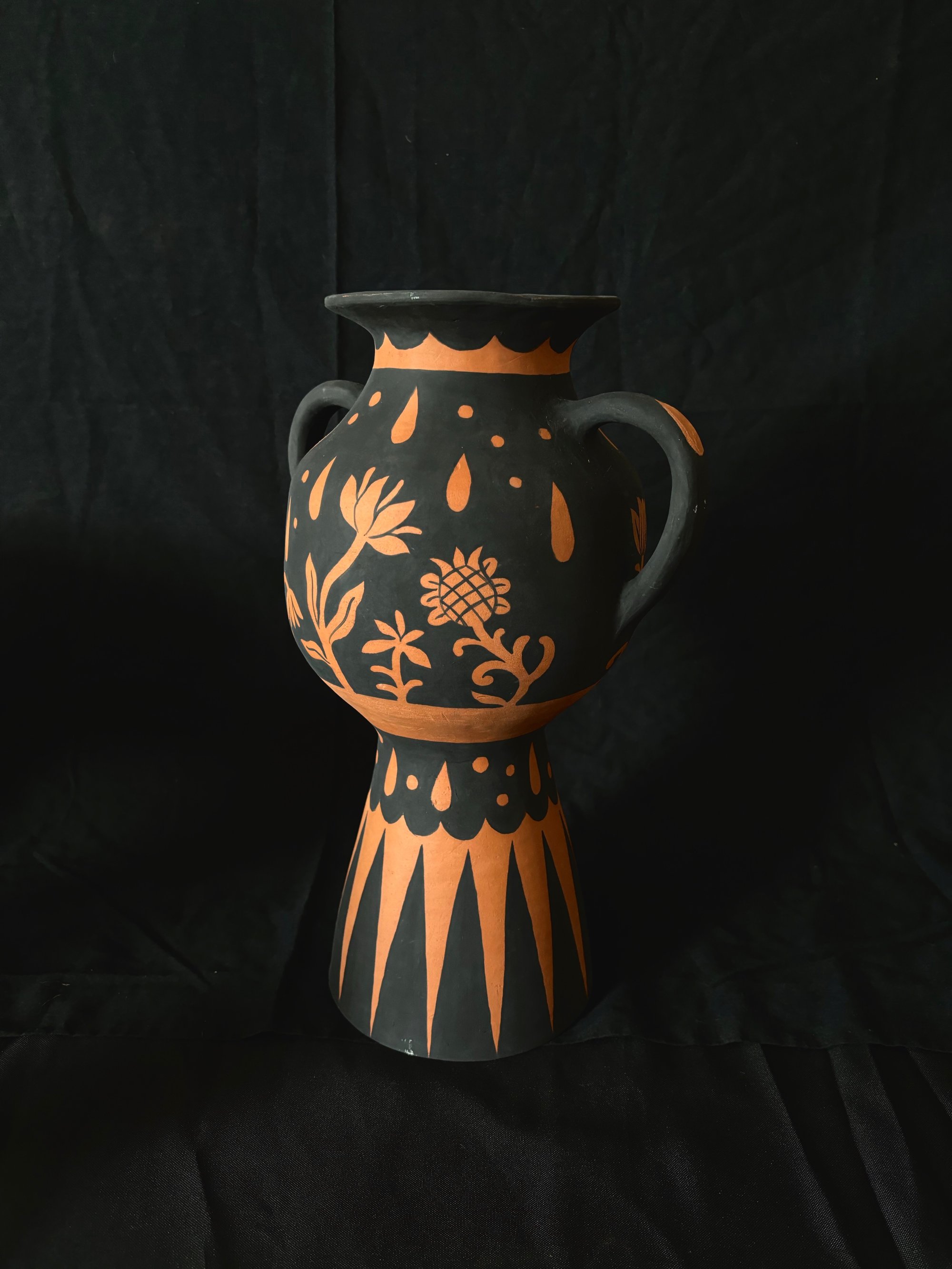 A one off earthenware terracotta urn with velvet underglaze decorations. Unglazed.